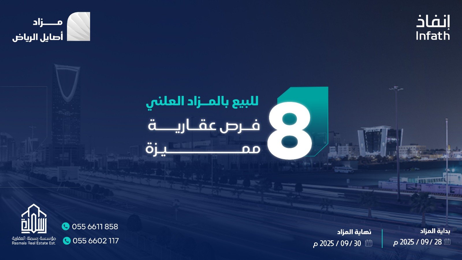 تعلن مؤسسة رسملة العقارية وتحت إشراف مركز الإسناد والتصفية “إنفاذ” وبقرار من محكمة التنفيذ وبحكم من محكمة الأحوال الشخصية عن البيع بالمزاد العلني ل 8 فرص عقارية في مدينة الرياض